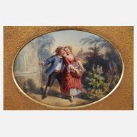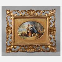 Anfang 20. Jh., ovale, leicht gewölbte Porzellanplatte mit feiner polychromer Aufglasurbemalung, Rokokoszene mit turtelndem Gärtnerpaar in idealisierter Landschaft, in Florentiner Goldstuckrahmen (eine Ecke geklebt) mit Rahmeretikett E. Dörfel & Sohn Berlin, Platte mit minimaler Kleberspur am oberen Rand, L Platte ca. 15,5 cm, Maße gesamt 25 x 29 cm. Pendant zu vorheriger Position.
