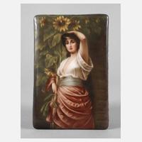 nach einem Gemälde von Nathaniel Sichel (1843 Mainz bis 1907 Berlin), Pressmarke 1865-1920, Prägenummer 107 sowie altes Klebeetikett mit Bezeichnung, hochrechteckige und leicht gewölbte Porzellanplatte mit feiner polychromer Aufglasurbemalung, Darstellung einer jungen südländischen Frau, große Sonnenblumen haltend, signiert Kirchner, in profilierter Goldleiste, Wange minimalst berieben, Maße Platte 15 x 10 cm.
