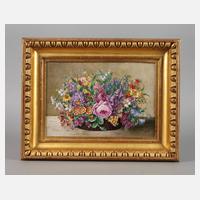 Anfang 20. Jh., blaue Zeptermarke und geritzte Größenangabe, recto signiert K. Paul (wohl Konrad Paul), rechteckige Porzellanplatte mit feiner polychromer Aufglasurmalerei, detailreiche Darstellung eines üppig gefüllten Blumenkorbs vor beigem Hintergrund, in vergoldetem Holzprofilrahmen mit Kymation, guter Zustand, Maße Platte ca. 19 x 27,5 cm.