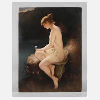 um 1910, Pressmarke, Prägenummer 255 und 195, geprägtes Dreieck und Buchstabe h, hochrechteckige Porzellanplatte mit feinster polychromer Aufglasurbemalung, Darstellung einer in einer Höhle sitzenden Nymphe als Damenakt mit durchscheinender Tuchdraperie, zu ihren Füßen zwei Fische schwimmend, wohl nach einem Gemälde von Wilhelm Kray (1828 Berlin bis 1889 München), rechts unten signiert Wenzel, vereinzelt winzige Farbflecken, rückseitig Restspuren alter Rahmung, Maße Platte 25 x 19 cm.