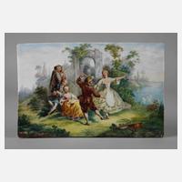 blaue Schwertermarke 1934–1945, 1. Wahl, querrechteckige Porzellanplatte mit feiner polychromer Aufglasurmalerei, Darstellung einer sich in Ideallandschaft vergnügenden Rokokogesellschaft, in einer Ecke minimaler Farbabrieb und rückseitig winzigst gechipt, Maße 14 x 21 cm.