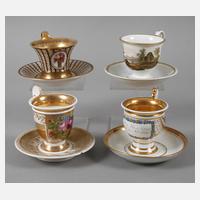 drei um 1820/40, teils unterglasurblaues Pinselzeichen und -nummer sowie Prägebuchstaben HE, in Glockenbecherform mit gekehltem Standfuß und hochgezogenem Voluten- bzw. Rosettenhenkel sowie passenden Untertassen, dazu Tasse Thomasporzellan in Kalathosform mit Campanerhenkel und dazugehöriger Untertasse, grüne Stempelmarke um 1920, alle mit polychromer Aufglasurbemalung und teils reicher Goldstaffage und Vergoldung, darunter eine mit Landschaftsdarstellung, die anderen mit Blumenmalerei und einmal mit Spruch, Vergoldung unterschiedlich stark berieben und drei Teile minimal gechipt, H gesamt 9,5 bis 12 cm.