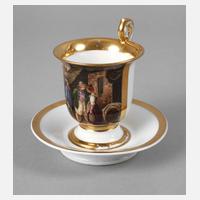 um 1840, ungemarkt, Glockenbecherform mit gekehltem Fuß, eingerolltem Schwanenhalshenkel und schauseitiger Rechteckkartusche mit Fischerszene in feiner polychromer Aufglasurbemalung nach dem Gemälde "Heiratsantrag auf Helgoland" von Rudolf Jordan 1834, Goldstaffage und breite Goldränder, dazu passende Untertasse, Vergoldung minimal berieben, H gesamt 12 cm.