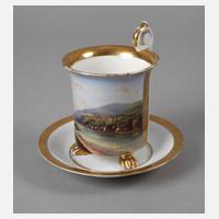 um 1840, ungemarkt, Zylinderform mit drei Löwentatzenfüßen, hochgezogenem Rosettenhenkel und schauseitiger Rechteckkartusche mit Vedute in feiner polychromer Aufglasurbemalung, Blick auf die Neckarbrücke und das Heidelberger Schloss, flankiert von goldradierten Weinranken und Goldstaffage, dazu passende Untertasse, Vergoldung minimal berieben, H gesamt 12 cm.