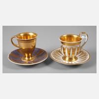 unterglasurblaue Zeptermarken um 1820, teils Präge- und Pinselzeichen, eine Tasse in gefußter Glockenbecherform mit hochgezogenem Henkel mit Steg, reicher Vergoldung und Strahlenkranzdekor sowie dazugehöriger Untertasse gleicher Ornamentik, die andere Tasse in ovaler Glockenbecherform mit gekehltem Fuß, Seitenhenkel, kompletter Vergoldung sowie umlaufendem goldradierten Ankanthus- und Lotusblütenfries, dazu ungemarkte Untertasse der Zeit mit goldradiertem Floraldekor und blauem Teilfond, diese mit rückseitigem Haarriss, sonst altersgemäß guter Zustand mit minimalen Gebrauchsspuren, H gesamt 12 und 10,5 cm.