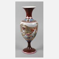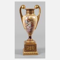 im Alt-Wiener Art, wohl Manufaktur Rädler & Pilz, um 1900, unterglasurblaue Bienenkorbmarke, Pinselnummer 35002 und Bezeichnung, im Motiv signiert Wagner (wohl Franz Wagner, tätig in Wien ca. 1894–1908), zweiteilig montiert, über quadratischem Postament und Rundfuß ovoider Korpus mit zylindrischem Hals und zwei hochgezogenen Volutenhenkeln, aufwendig verziert mit feiner Aufglasurbemalung über gelbem Fond, schauseitig allegorische Darstellung einer jungen Frau mit musizierender Amorette, rückseitig Amorettenpaar mit Fackeln (nach Jaques Gabriel Huquier), reiche ornamentale und florale Reliefgoldmalerei über bordeauxfarbenem Fond sowie Goldstaffage, ohne Deckel, guter Zustand, H 25,5 cm.