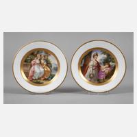 im Wiener Stil, jeweils undeutliche Pressmarke 1865–1920, imitierte unterglasurblaue Bienenkorbmarke, geprägte Nummer 12.5 und Buchstabe S sowie Bezeichnung in Eisenrot, glatte Form mit feiner polychromer Aufglasurbemalung, im Spiegel Darstellung der Königin Charlotte und der Genius bzw. The Dutchess of Devonshire and Viscountess Duncannon nach Gemälden von Angelika Kauffmann (1741 Chur bis 1807 Rom), Goldränder, ein Teller minimal berieben, sonst guter Zustand, D je 12,5 cm.