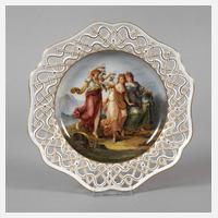 unterglasurblaue Schwertermarke um 1815, 1. Wahl, tief gewölbter Teller mit durchbrochen gearbeiteter und goldstaffierter Fahne, im Spiegel mythologische Szene in feiner polychromer Aufglasurbemalung, Darstellung dreier Frauen in antikisierenden Gewändern nach dem Gemälde "Schönheit, unterstützt von Prudence, verachtet das Opfer der Torheit" von Angelika Kauffmann um 1780, ein winziger Brandfleck im Motiv, sonst sehr guter Zustand, D 27 cm. Quelle: Porzellan und anderes Kunsthandwerk nach Angelika Kauffmann, Ausstellungskatalog 1998/99, sowie R. E. Röntgen, The Book of Meissen, S. 169 Formabbildung.