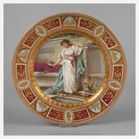 im Alt-Wiener Stil, wohl Manufaktur Rädler & Pilz, um 1900, unterglasurblaue Bienenkorbmarke, Präge- und Pinselnummer sowie Bezeichnung, im Motiv signiert Wagner (Porzellanmaler Franz Wagner, tätig in Wien ca. 1894–1908), glatte, leicht gewölbte Form, im Spiegel antikisierende Darstellung einer sich im Handspiegel betrachtenden Dame in feiner polychromer Aufglasurbemalung, Fahne mit prunkvoller Reliefgoldmalerei über verschiedenfarbigen Fondfeldern sowie Goldrand, Vergoldung partiell berieben, D 24 cm.