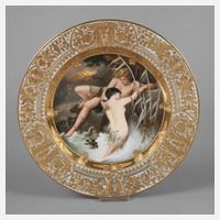 im Alt-Wiener Stil, wohl Manufaktur Rädler & Pilz, um 1900, unterglasurblaue Bienenkorbmarke, blasse Pinselnummer 360/dK und Bezeichnung, im Motiv teils vom Goldfries überdeckte Malersignatur Wagner (Porzellanmaler Franz Wagner, tätig in Wien ca. 1894–1908), glatte, leicht gewölbte Form, im Spiegel szenische Darstellung eines am Ufer liegenden Fischers beim Umarmen einer Nixe in feiner polychromer Aufglasurbemalung, Fahne mit prunkvollem Floraldekor in Reliefgoldmalerei über hellblauem Fond sowie Goldrand, sehr guter Zustand, D 24,5 cm.
