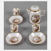 teils blaue Pinselmarke 1805–1835 und Prägebuchstabe H, zylindrische Empireform mit abgewinkelten Henkeln, idealisierte Landschaftsdarstellungen in brauner Aufglasur-Camaieumalerei, Goldstaffage sowie Goldränder, bestehend aus Kaffeekanne, Zuckerdose und zwei Tassen mit Untertassen, Knäufe und ein Henkel bestoßen, eine Untertasse mit Glasurspinne, H Kanne ca. 16 cm.