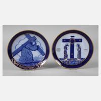 jeweils bezeichnet und datiert, grüne Stempelmarke und Entwurfstempel Fritz Klee bzw. Carl Rehm, glatte, leicht gewölbte Form mit unterglasurblauem und goldstaffiertem religiösen Dekor zur Erinnerung an die Passionsspiele, Wandaufhängung, sehr guter Zustand, D je 22,5 cm.