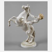 Entwurf Karl Tutter 1939, grüne Stempelmarke mit Zusatz Germany Kunstabteilung 1938–1955, Stempelnummer 4 und Entwerfersignatur, naturalistische Ausformung mit pastelltoniger Unterglasurbemalung, über rundem Grassockel auf steigendem Apfelschimmel sitzendes nacktes Mädchen, sehr guter Zustand, H 31 cm.