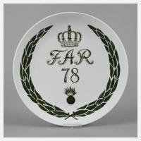 unterglasurblaue Schwertermarke 1934–1945, 1. Wahl, Prägenummern, glatte Form mit grüner Unterglasurbemalung, Krone mit Regimentsangabe FAR 48 und brennender Kanone im Lorbeerkranz, Wandaufhängung, guter Zustand, D 25,5 cm.