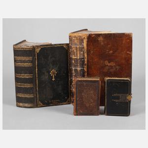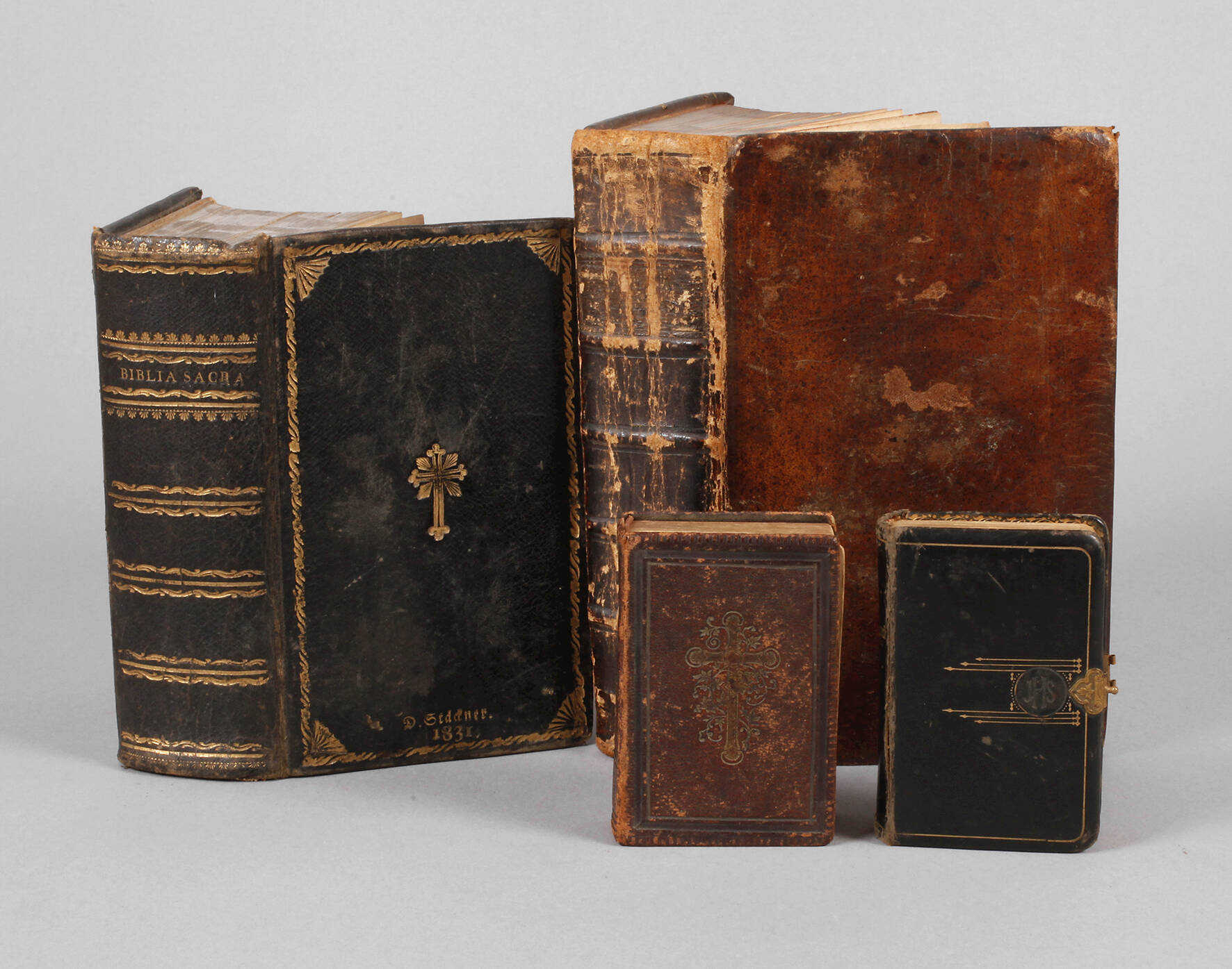 Biblia sacra vulgatae editionis, Coloniae sumptibis Tornaesiorum o. J.; Die ganze Heilige Schrift Alten und Neuen Testaments [...] mit einer Vorrede von Johann Georg Rosenmüller, Zwickau in der Höferschen Buchdruckerei o. J. (Buchdeckel datiert 1831); Geistliches Senfkörnlein 1870; Der Christ im Gebete, München o. J.; unterschiedliche, gute Erhaltung.