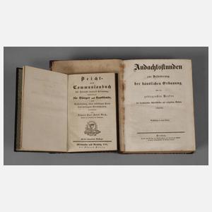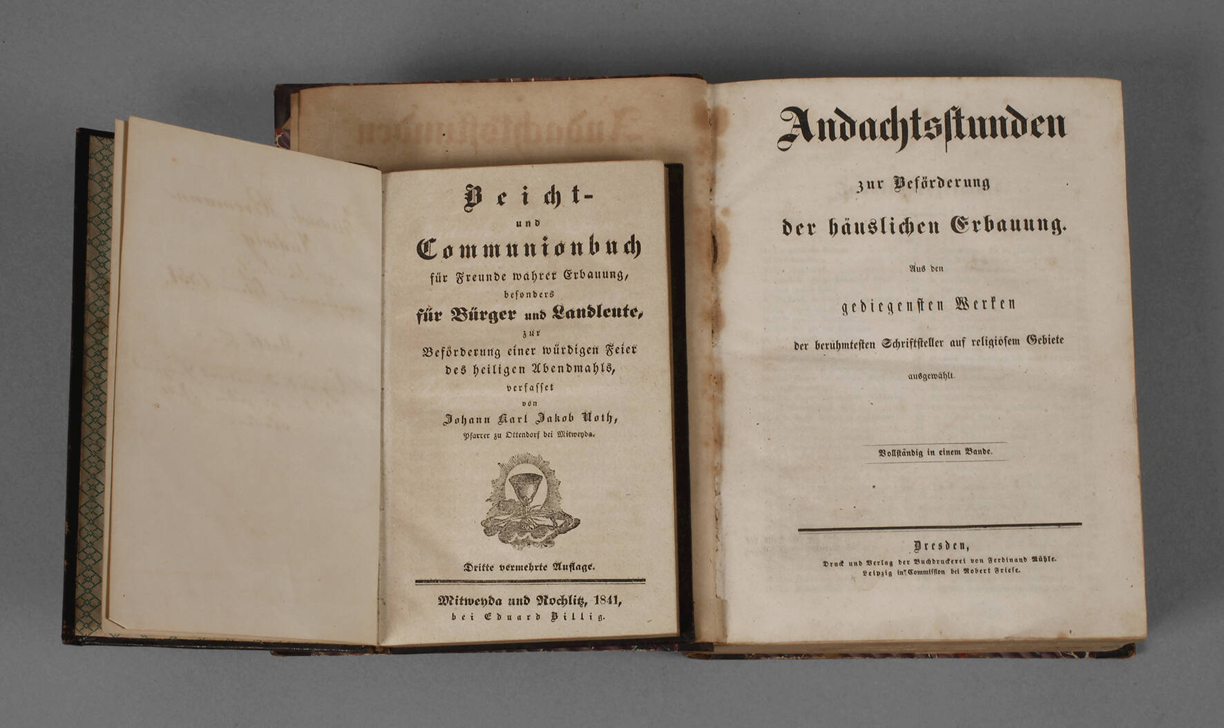 Andachtsstunden zur Beförderung der häuslichen Erbauung, aus den gediegensten Werken der berühmtesten Schriftsteller auf religiösem Gebiete ausgewählt, Dresden ohne Jahr [1850], Format Gr. 8°, 790 S. – Beicht- und Communionbuch für Freunde wahrer Erbauung, besonders für Bürger und Landsleute zur Beförderung einer würdigen Feier des heiligen Abendmahls, verfasset von Johann Karl Jakob Roth, 3. Auflage, Mittweida und Rochlitz 1841, Format Kl. 8°, 221 S.; jeweils altersgemäß erhalten.