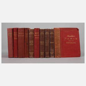 Meyers Reisebücher: Nordseebäder 1912, Unteritalien und Sizilien 1909, Thüringen 1908, Norwegen/Schweden und Dänemark 1911. – Baedeker: Northern Italy 1903, Paris [Titelblatt defekt], Nord-Est de la France 1908, Paris 1888, Suisse 1896. – Hartlebens illustrated guide No. 40/Vienna 1891; unterschiedliche, sichtbare Gebrauchsspuren.