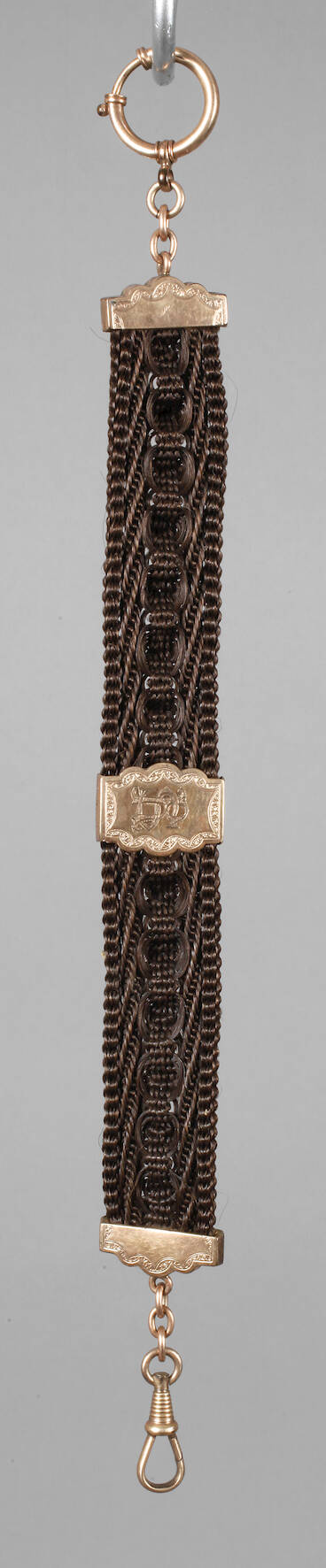 2. Hälfte 19. Jh., aus braunem Echthaar geflochten, vergoldete Beschläge, mit Besitzermonogramm, Z 1, L 25 cm.