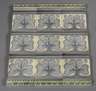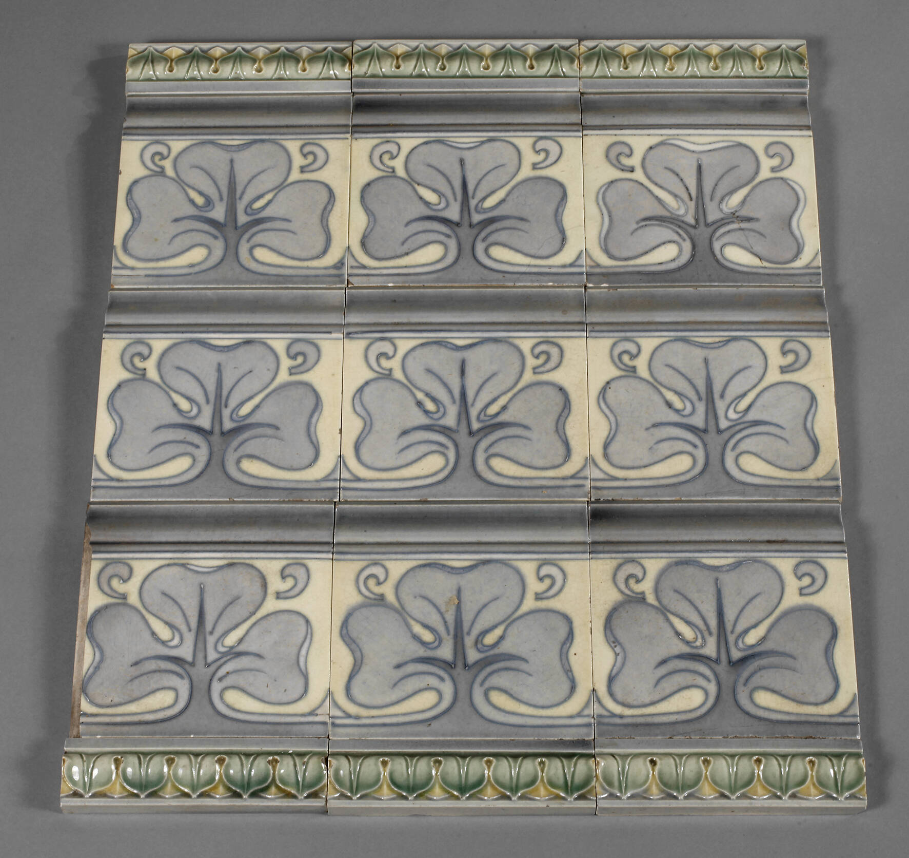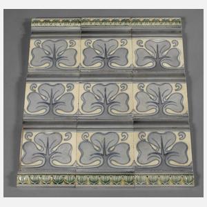 um 1900, ungemarkt, heller Steingutscherben, beige und hellblau glasiert, reliefiertes Floralmotiv, bestehend aus neun großen Fliesen und sechs Riemchen, sauber ausgebaut, Maße 15 x 15 cm und 15 x 4 cm.
