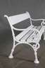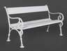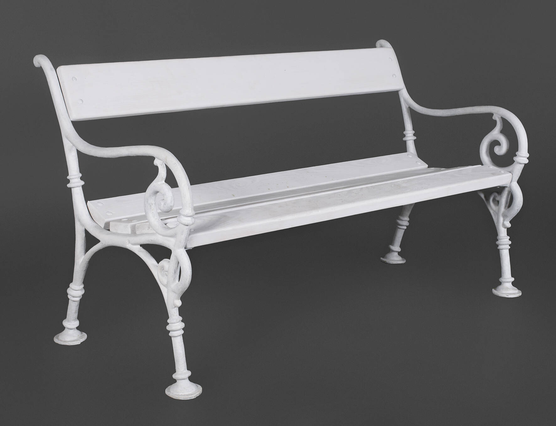 um 1860, gusseisernes Gestell, weiß gestrichen, erneuerte Beplankung aus Nadelholz, Maße 76 x 134 x 62 cm.