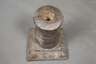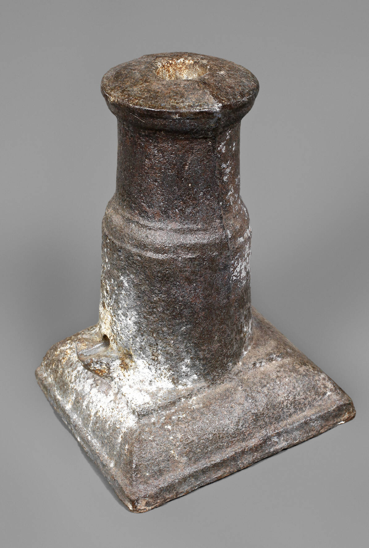 19. Jh., Gusseisen, große quadratische Grundplatte, Alters- und Gebrauchsspuren, Maße 25 x 16 x 16 cm.