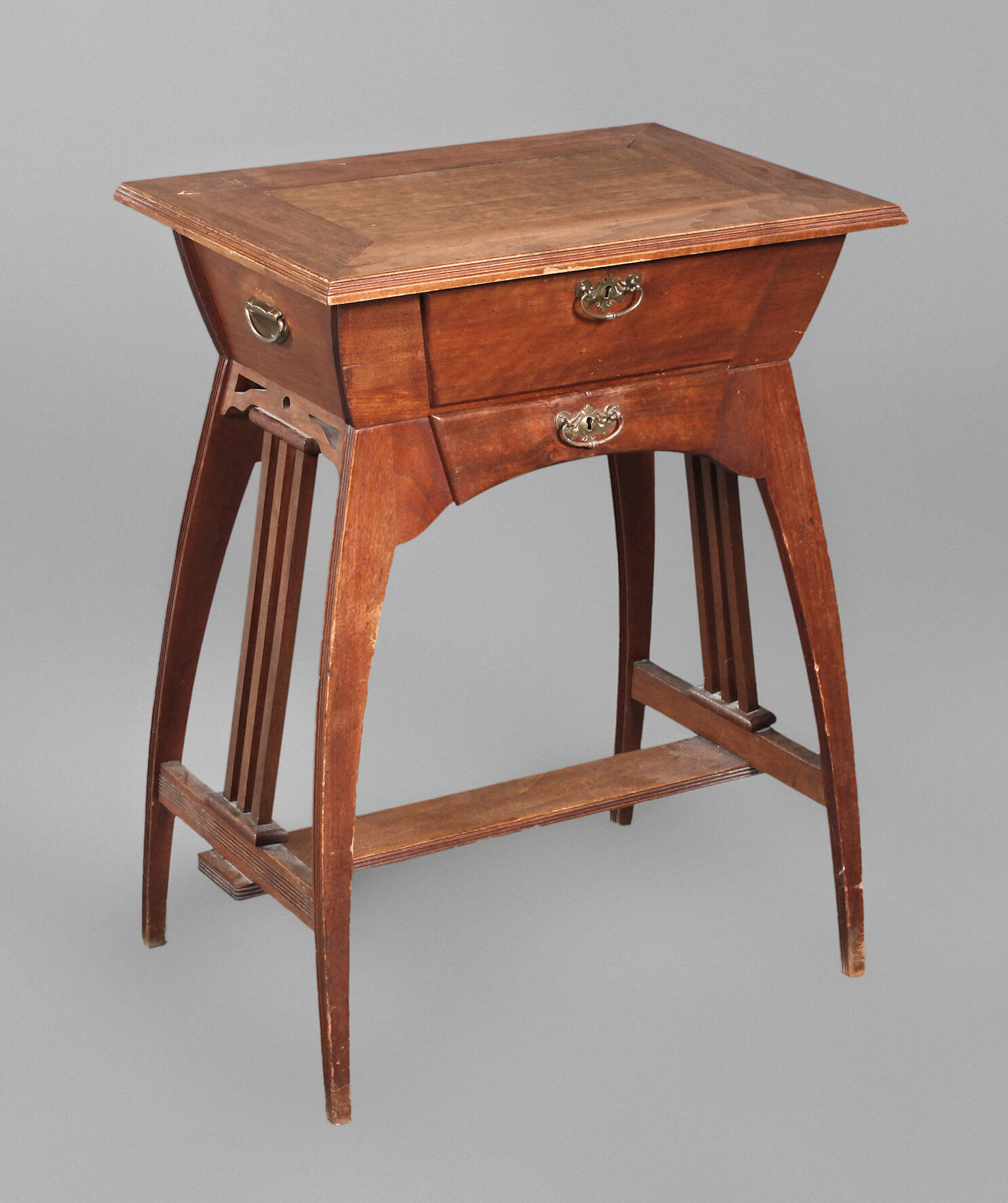 wohl Dresden, um 1905, Mahagoni massiv, klappbare Platte mit Inneneinrichtung, darunter kleiner Schubkasten, seitlich Tragegriffe, guter unrestaurierter Originalzustand, Maße 77 x 59 x 40 cm.