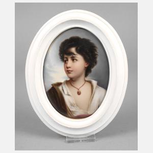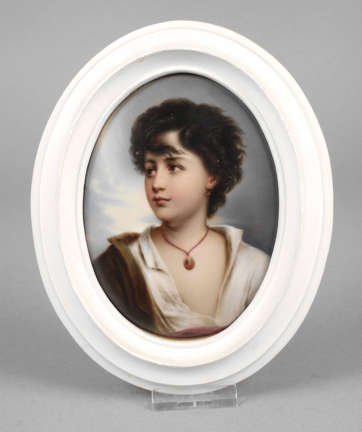 nach einem Gemälde von Gustav Karl Ludwig Richter (1823 Berlin bis 1884 ebenda), um 1900, Marke wohl überklebt, ovale, leicht gewölbte Porzellanplatte mit feiner polychromer Aufglasurmalerei, Brustportrait eines südländischen Knaben mit stürmischer Frisur, offenem Hemd, Ohrring und Medaillon um den Hals, neuzeitlich auf Papier montiert und gerahmt, guter Zustand, L Platte 13 cm.