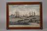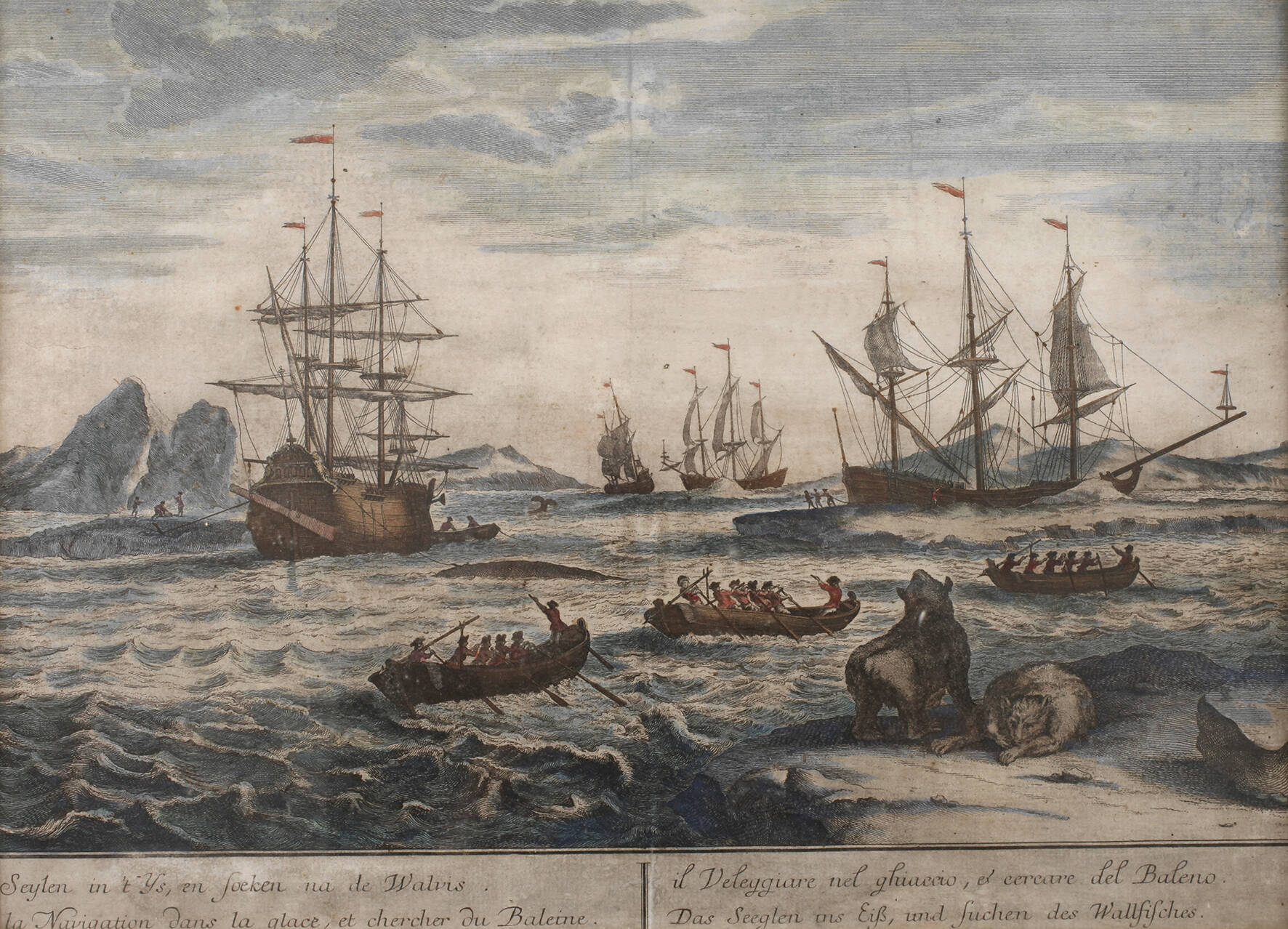 zahlreiche Segelschiffe und Boote beim Walfang, im Vordergrund zwei Bären, unter der Darstellung in verschiedenen Sprachen bezeichnet „Das Seeglen ins Eiß, und suchen des Wallfisches.“, kolorierter Kupferstich, 2. Hälfte 18. Jh., mittig Faltlinie, Altersspuren, hinter Glas gerahmt, Darstellungsmaße ohne Schrift ca. 26 x 39,5 cm. Künstlerinfo: dt. Bildnis und Vedutenstecher sowie Verleger (1732 Augsburg? bis 1801 Augsburg?), Schüler und Sohn des Johann Balthasar Probst (1673–1748) und Vater des Georg Mathäus Probst (gestorben 1788), Schüler seines Vaters, übernahm nach dessen Tod 1750 einen Teil des Verlags "Wolffs Erben (Haeres Jer. Wolffii)” und führte ihn unter eigenem Namen fort, tätig in Augsburg, Quelle: Thieme-Becker und Internet.