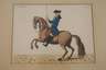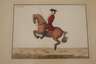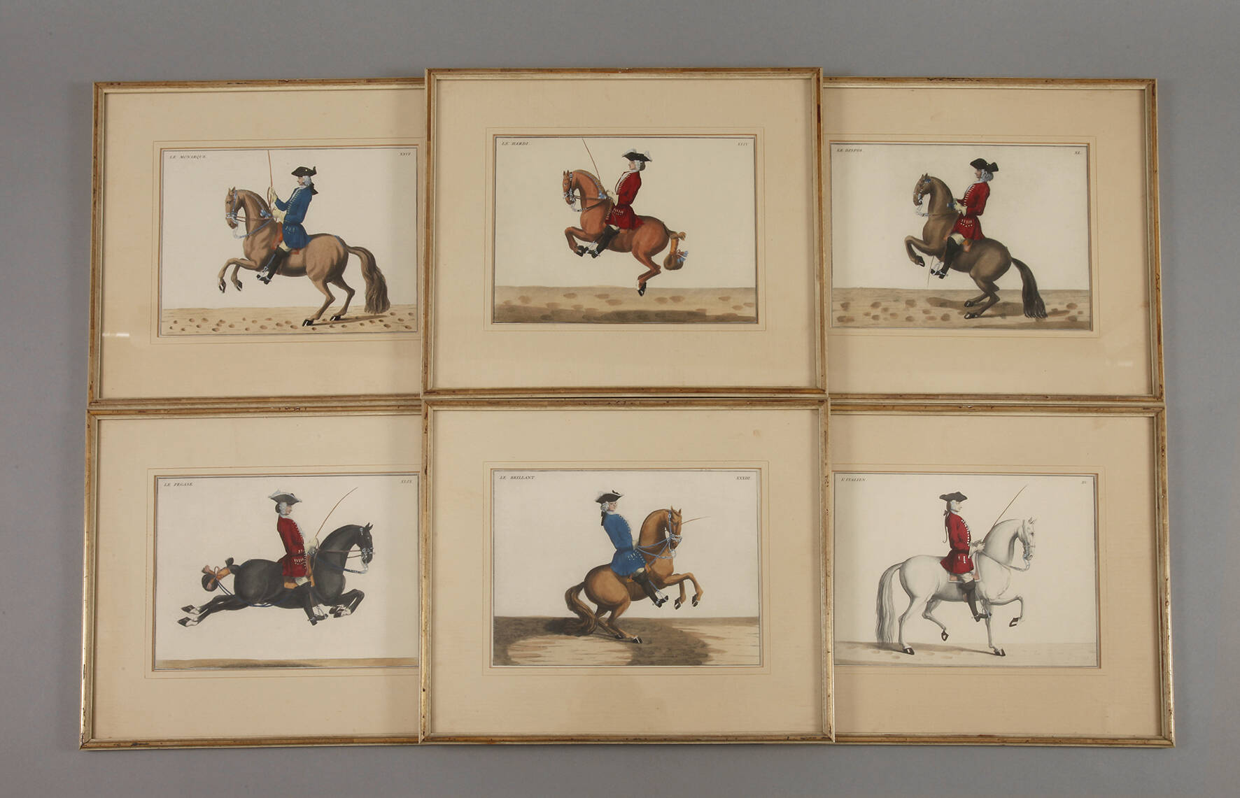 Folge von sechs kolorierten Kupferstichen zum Thema Reiten, Ende 18. Jh., jeweils betitelt „L´Italien“, „Le Monarque“, „Le Brillant“, „Le Dispos“, „Le Hardi“, „Le Pegase“, je unter Passepartout und hinter Glas gerahmt, Passepartoutausschnitt ca. 20 x 27 cm.
