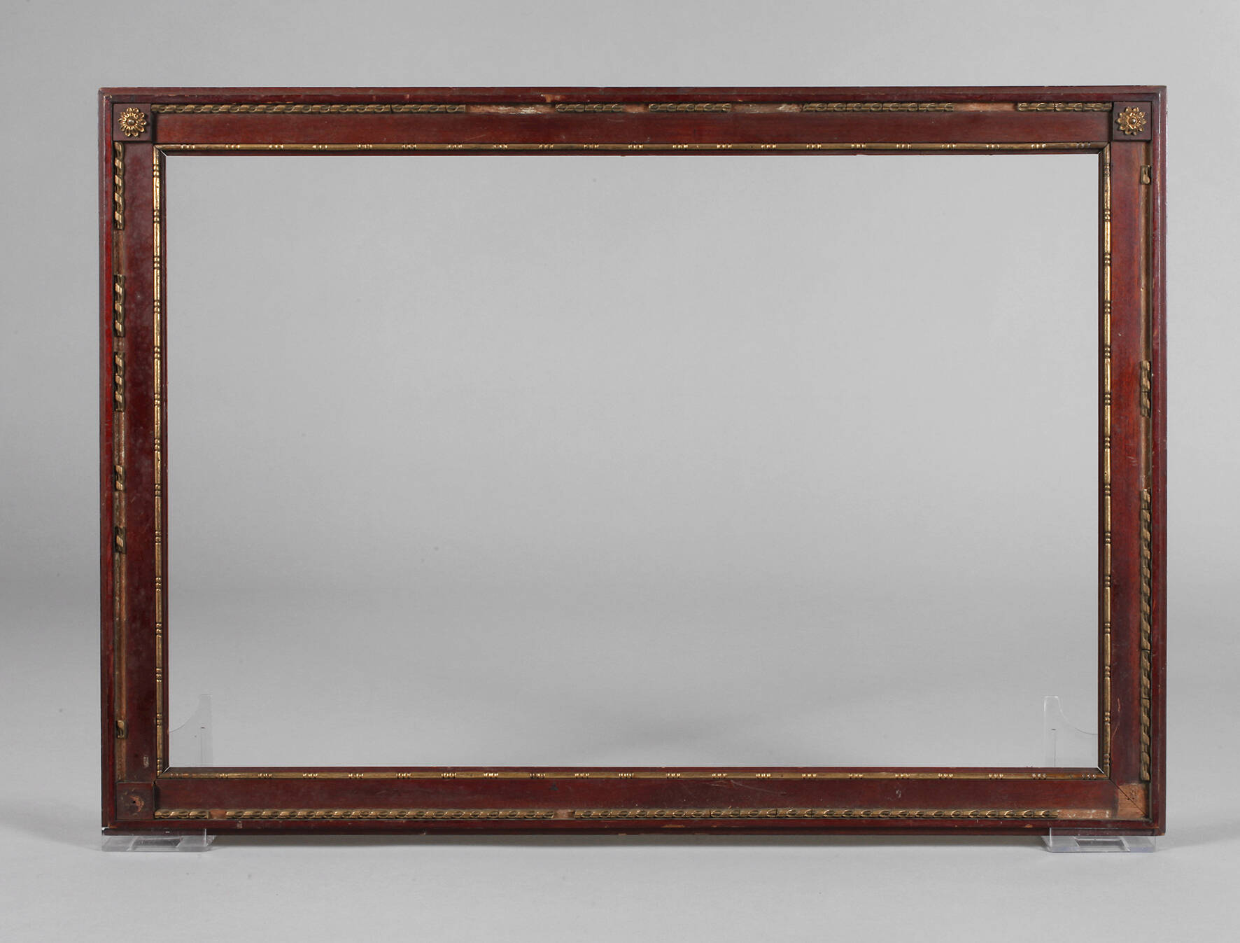 um 1890, Rahmen aus ca. 5 cm breiter, schlicht steigend profilierter, mit schmalen vergoldeten Stuckkanten verzierter Holzleiste, Ecken quadriert mit vergoldeter Rosette, restaurierungsbedürftig, Falzmaße ca. 45 x 68 cm.
