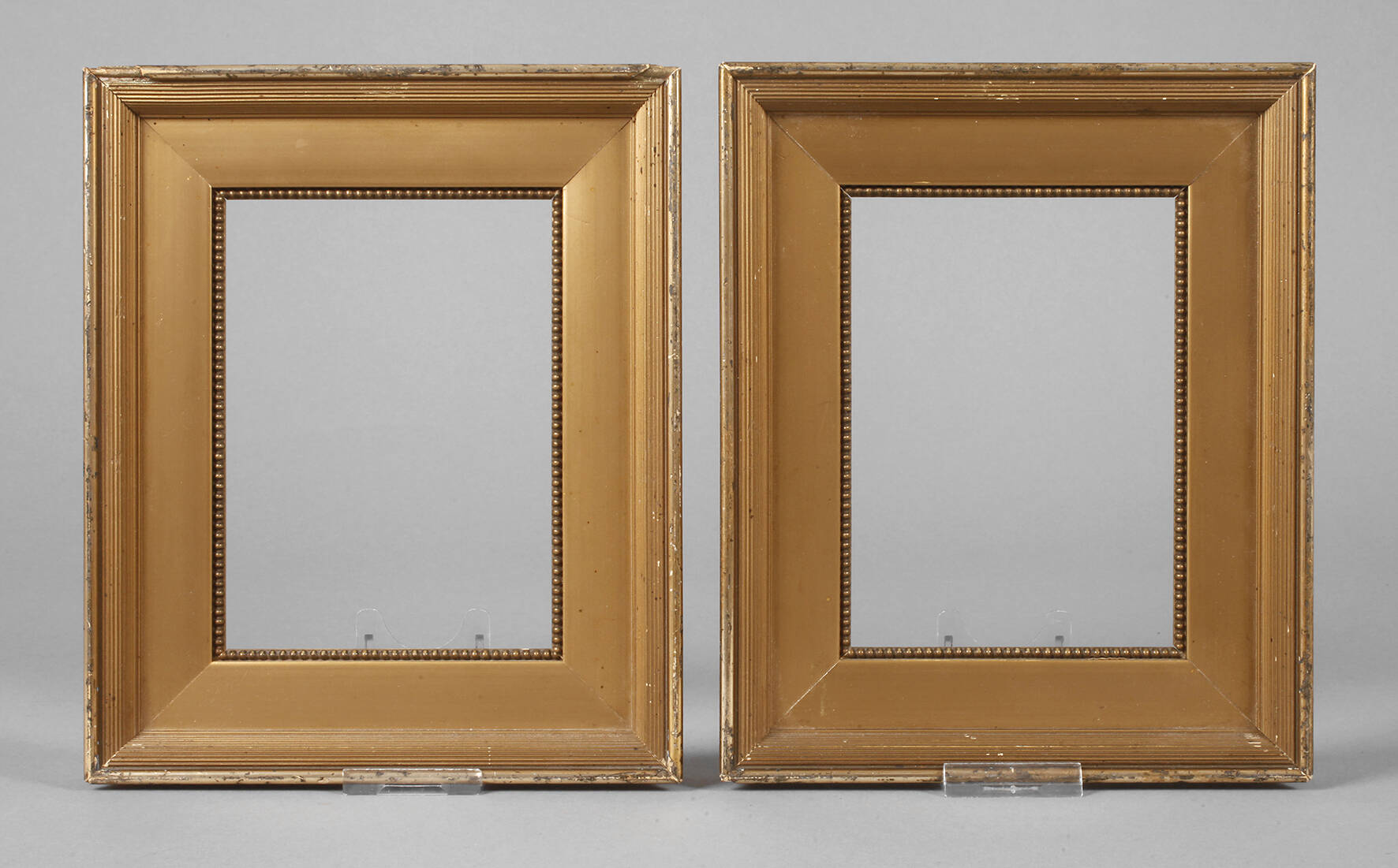 Mitte 20. Jh., ca. 4 cm breite gestuckte und vergoldete Leisten, am Rand gewölbt und gerippt, die Innenkante als Perlband verziert, eine mit zwei Fehlstellen an den Kanten, etwas restaurierungsbedürftig, Falzmaße 15,5 x 11,5 cm.
