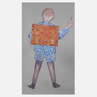 um 1970, ungemarkt, Betonguss mit Eisenverstrebungen, dekorativ mit mehrfarbigen, langrechteckigen Mosaiksteinen verziert, in Form eines Knaben als Rückenfigur, seinen Schulranzen geschultert und den Zeigefinger mahnend erhoben, Altersspuren, H 132 cm.