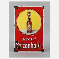 um 1905, ohne Hersteller, mit Eigentumsvermerk der Brauerei, hochrechteckiges, gebauchtes Schild, mehrfarbig emailliert und zart reliefiert, vier originale Bohrungen, stärkere Substanzverluste auch im Innenbereich, Z 3, Maße 60 x 39 cm.