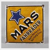 Replikat, gemarkt Ferro Email C. Robert Dold, quadratisches, gebauchtes Schild für die Marswerke Nürnberg-Doos, vierfarbig emailliert mit Sternmotiv, vier originale Bohrungen, kleinere Emailverluste, Z 2, Maße 33 x 33 cm.