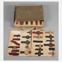 um 1920, acht Tafeln mit Musterproben verschiedenster Ledergürtel in unterschiedlichen Färbungen und Prägungen, alle handschriftlich nummeriert und teils bezeichnet, staffiert mit unterschiedlichen Schließmechanismen bzw. Verzierungen aus Holz, Messing oder Weißmetall, Altersspuren, Schuber lädiert, Maße ca. 45 x 32 cm.
