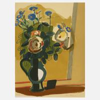 Henkelkrug mit üppigem Blumenstrauß vor einer Wand, Farbsiebdruck, um 1960, im unteren Bereich von Hand links nummeriert „22/56“ und rechts signiert „Ernst Schumacher“, rückseitig in Blei bezeichnet "Prof. Ernst Schumacher (Akademie Berlin) Sommerstrauß 100.-", gering braunfleckig und im Randbereich knitterspurig, Darstellungsmaße ca. 61,5 x 47,5 cm. Künstlerinfo: dt. Maler, Graphiker und Hochschullehrer (1905 München-Gladbach bis 1963 Berlin), ab 1921 Studium der Malerei an der Düsseldorfer Akademie und hier Beeinflussung durch Max Stern, Studienreisen nach Süditalien, Frankreich, Holland, ab 1922 Mitglied der Künstlergruppe Das Junge Rheinland, mehrfach Ausstellungen bei Mutter Ey und in der Kunsthalle Düsseldorf, ab 1928 Mitglied der Rheinischen Sezession, 1933 Ausstellung in der Galerie Jeanne Castel in Paris, während der NS-Zeit zog sich der Künstler in die innere Emigration zurück, ab Ende der 1930er Jahre bis 1947 lebte der Künstler in Schwarzenbach an der Saale, 1947 Berufung zum Professor an die Hochschule für Bildende Künste in Berlin durch Karl Hofer, 1958 Villa Massimo-Preis, Quelle: Wikipedia.