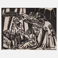 Gruppe von älteren Menschen, den Tod anflehend und Schriftband "Komm süsser Tod", Holzschnitt, 1922, rückseitig typographisch bezeichnet "Richard Seewald aus dem Camposanto/Holzschnitt", Papier gleichmäßig leicht gebräunt, Darstellungsmaße ca. 14 x 17,8 cm, Blattmaße ca. 20,3 x 27,5 cm. Künstlerinfo: dt. Maler, Grafiker und Schriftsteller (1889 Arnswalde/Neumark bis 1976 München), bereits zu Zeiten als Gymnasiast erschienen einige seiner Zeichnungen in der Zeitschrift „Jugend“, ab 1909 Studium der Architektur und autodidaktische Beschäftigung mit der Malerei, Ausstellung in der Modernen Galerie Tannhauser, 1913 entstand sein erstes Ölgemälde, nachfolgend zahlreiche Illustrationsaufträge, 1919 Einzelausstellung in der Kunsthandlung Hans Goltz, nachfolgend zahlreiche Studienreisen in den Mittelmeerraum, 1924 Berufung als Professor an die Kölner Werkkunstschule, 1931 Umzug von Köln nach Ronco sopra Ascona/Schweiz, ab 1954 Professur an der Akademie der Bildenden Künste in München, Quelle: Thieme-Becker, Vollmer und Wikipedia.