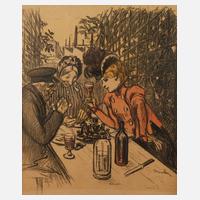 drei an einem Tisch sitzende Personen beim Essen von Muscheln und im Hintergrund Fabrikanlage, Farblithographie (oder Farboffsetlithographie), um 1900, rechts unten im Stein signiert "Steinlen", gebräunt, unter Passepartout und hinter Glas gerahmt, Passepartoutausschnitt ca. 27,5 x 23,5 cm. Künstlerinfo: französischer Maler, Zeichner, Grafiker und Illustrator mit schweizerischen Wurzeln (1859 Lausanne bis 1923 Paris), ab 1878 als technischer Zeichner in Paris tätig, lebte seit 1883 in Montmatre, hier Bekanntschaft mit Adolphe Wilette und Freundschaft mit Henri de Toulous-Lautrec und als Entwerfer für Kabarett und Zeitschrift „Le Chat Noir“ tätig, 1911 Gründung der Zeitschrift „Les Humorites“ und Tätigkeit als Buchillustrator, Quelle: Wikipedia.