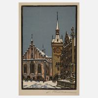 winterlicher Blick über den Marienplatz mit der Mariensäule stadtauswärts, Farbholzschnitt, unter der Darstellung in Blei signiert „C. Thiemann“, eingeheftet in eine Klappkarte mit zwei Briefmarken „Heinrich von Stephan“ zu 24 und 75 Pfennig, mit Sonderstempel „Zur Überwindung der deutschen Not - Ministerpräsidentenkonferenz 8.6.1947“, Darstellungsmaße ca. 15,2 x 10,4 cm, Blattmaße ca. 17,7 x 12,5 cm. Künstlerinfo: bedeutender sudetendt. (österr.) Maler, Radierer, Holzschneider und Gebrauchsgraphiker (1881 Karlsbad bis 1966 Deutenhofen), zunächst Kaufmannslehre und 10 Jahre technischer Büroangestellter, autodidaktische Hinwendung zur Malerei, studiert ab 1905 mit Stipendium an der Prager Akademie, hier Meisterschüler von Franz Thiele, anschließend Europareise durch Holland, Belgien, Italien und Frankreich, 1906-08 Ateliergemeinschaft mit Walter Klemm in Libotz bei Prag, ab 1908 tätig in Dachau bei München, 1908 kurzzeitig Lehrtätigkeit an der Debschitz-Schule in München, 1910 Mitglied der Wiener Sezession und des Deutschen Künstlerbundes Weimar, beschickte zahlreiche Ausstellungen, in mehreren bedeutenden Sammlungen und Museen vertreten (unter anderen Albertina Wien, Kunstgewerbe-Museum Berlin, Weimar, Darmstadt, Leipzig, Kupferstichkabinett Dresden), weiterhin Mitglied in zahlreichen Kunstvereinigungen wie der Deutschen Gesellschaft der Wissenschaft und Künste Prag, dem Deutschen Werkbund, dem Bund Deutscher Gebrauchsgraphiker, dem Metznerbund und 2. Vorsitzender des Dachauer Kunstvereins, 1960 Verleihung der Josef-Hofmann-Plakette, Quelle: Thieme-Becker, Vollmer, Internet und Dressler.