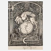 auf einer Kugel sitzender Drache, umgeben von allerlei Symbolen, Lithographie, um 1910, unter der Darstellung in Blei signiert "Hans Thoma", leichte Altersspuren, unter Passepartout und hinter Glas gerahmt, Darstellungsmaße ca. 20,5 x 16,8 cm. Künstlerinfo: dt. Maler und Graphiker (1839 Bernau bis 1924 Karlsruhe), zunächst zeitweise Lehre als Lithograph und Stubenmaler in Basel sowie Uhrenschildermacher in Furtwangen, parallel autodidaktische Mal- und Zeichenstudien, studierte 1859–66 an der Kunstschule Karlsruhe bei Ludwig Des Coudres und Johann Wilhelm Schirmer, anschließend kurzzeitig in Basel und Düsseldorf, 1868 Aufenthalt in Paris, hier beeinflusst von Gustave Courbet und der Schule von Barbizon, 1870–76 in München, 1874 erste Italienreise mit Aufenthalt in Rom, ab 1878 tätig in Frankfurt am Main, 1899–1901 in Kronberg und Mitglied der Kronberger Malerkolonie, freundschaftlich verbunden und angeregt durch Arnold Böcklin, Wilhelm Leibl, Wilhelm Steinhausen und Wilhelm Trübner, 1899 zum Professor ernannt, 1899–1920 Direktor der Kunsthalle Karlsruhe, Quelle: Thieme-Becker und Internet.