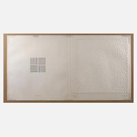 Doppelblatt mit einer Textgestaltung von Prof. Eugen Gomringer "Jeder sieht es anders"und einen Prägedruck von Prof. Günther Uecker "Interferenzen", je unter der Darstellung in Blei signiert, bei der Arbeit von Günther Uecker unten links in Blei nummeriert „111/300“, siehe van der Koelen: Günther Uecker, Opus Liber WVZ-Nr. L7510, leichte Altersspuren, Bogenmaß geöffnet ca. 50,5 x 93 cm. Künstlerinfo Günther Uecker: dt. Maler und Objektkünstler (1930 Wendorf bei Crivitz), Kindheit auf Wustrow, 1949–53 Studium der Malerei in Wismar und an der Kunstakademie Berlin-Weißensee, 1953 Übersiedlung nach Westberlin und 1955 nach Westdeutschland, 1955–57 Studium bei Otto Pankok an der Kunstakademie Düsseldorf, 1956/57 Entstehung seines ersten Nagelbildes, ab 1961 Mitglied der Künstlergruppe ZERO, 1970 Teilnahme an der Biennale in Venedig, 1974–95 Professur an der Kunstakademie Düsseldorf, Quelle: Wikipedia und Internet. Künstlerinfo Eugen Gomringer: bolivianisch-schweizerischer Schriftsteller, Begründer der Konkreten Poesie (geboren 1925 in Cachuela Esperanze/Bolivien), 1944–52 Studium der Nationalökonomie und Kunstgeschichte in Bern, 1954–57 Sekretär von Max Bill, 1953 zusammen mit Marcel Wyss und Dieter Roth Gründung der Zeitschrift Spirale, 1961–67 Leiter des Schweizerischen Werkbundes, 1967–85 Leiter des Kulturbeirates der Rosenthal AG in Selb/Bayern, 1977–90 Professor an der Kunstakademie Düsseldorf, ab 1971 Mitglied der Akademie der Künste, 2000 Gründung des Institutes der Konstruktiven Kunst und Konkreten Poesie, 1992 Eröffnung des Museums für Konkrete Kunst in Ingolstadt, Quelle: Wikipedia.