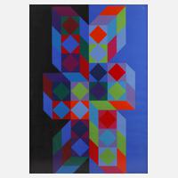 Komposition aus verschiedenen geometrischen Flächen, Farbserigraphie, um 1970, im Druck rechts unten signiert "Vasarely", hinter Kunststoffscheibe gerahmt, Falzmaße ca. 88 x 85 cm. Künstlerinfo: eigentl. Vásárhelyi Győző, frz. Maler und Grafiker mit ungarischer Abstammung (1906 Pécs bis 1997 Paris), Mitbegründer der Op-Art, Studium an der Akademie und an der Mühly-Schule in Budapest, 1930 Umzug nach Paris, 1930–40 als Werbegraphiker tätig, ab 1944 als Maler tätig und erste Ausstellung seiner Arbeiten in der Galerie Denise René, ab 1947 intensive Beschäftigung mit konstruktiven geometrischen Motiven, ab 1961 lebte er in Annet-sur-Marne, ab 1955 mehrmalige Teilnahme an der documenta in Kassel, Werke des Künstlers befinden sich in zahlreichen Museen und Sammlungen, Quelle: Vollmer und Wikipedia.