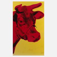 Kopf einer Kuh in Pink vor gelbem Grund, Farbserigraphie, an der unteren Blattkante Copyrightvermerk und datiert "1992", hinter Glas gerahmt, Blattmaße ca. 85 x 51 cm. Künstlerinfo: eigentlich Andrew Warhola, bedeut. us-amerik. Maler, Graphiker, Designer, Filmemacher und Verleger (1928 Pittsburgh bis 1987 New York City), Mitbegründer und zentrale Figur der amerik. Pop Art, stud. 1945–49 Gebrauchsgraphik am Carnegie Institute of Technology in Pittsburgh, anschließend Umzug nach New York und hier als freischaffender Künstler tätig, Quelle: Internet.