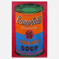 Darstellung von 100 Konservendosen, Farboffsetdruck, links unten Copyrightvermerk und datiert "1978", unter Kunststoffscheibe gerahmt, Darstellungsmaße ca. 75,5 x 55 cm. Künstlerinfo: eigentlich Andrew Warhola, bedeut. us-amerik. Maler, Graphiker, Designer, Filmemacher und Verleger (1928 Pittsburgh bis 1987 New York City), Mitbegründer und zentrale Figur der amerik. Pop Art, stud. 1945–49 Gebrauchsgraphik am Carnegie Institute of Technology in Pittsburgh, anschließend Umzug nach New York und hier als freischaffender Künstler tätig, Quelle: Internet.