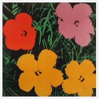 vier stilisierte Blüten und Gräser vor schwarzen Grund, Farboffsetlithographie nach Andy Warhol, im unteren Bereich Copyrightvermerk mit Datierung "1993", unter Passepartout und hinter Glas gerahmt, Passepartoutausschnitt ca. 65 x 65 cm. Künstlerinfo: eigentlich Andrew Warhola, bedeut. us-amerik. Maler, Graphiker, Designer, Filmemacher und Verleger (1928 Pittsburgh bis 1987 New York City), Mitbegründer und zentrale Figur der amerik. Pop Art, stud. 1945–49 Gebrauchsgraphik am Carnegie Institute of Technology in Pittsburgh, anschließend Umzug nach New York und hier als freischaffender Künstler tätig, Quelle: Internet.