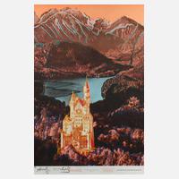 verfremdeter Blick auf Neuschwanstein vor imposanter Alpenkulisse, bei der für die Bayerische Rück herausgegebenen Edition handelt es sich um eines der letzten Werke vor dem Tod des Künstlers, hier Farbvariante III, Farbserigraphie, unter der Darstellung stempelsigniert "Andy Warhol", weiterhin Copyrightvermerk und Datierung "(C) 1987", eines von 1200 stempelsignierten Exemplaren, hinter Glas gerahmt, Darstellungsmaße ca. 85 x 60 cm, Blattmaße ca. 90,5 x 62 cm. beigegeben "Bruckmanns Pantheon", Sonderdruck für die Bayerische Rück zur Entstehung der Edition, Heft etwas fleckig. Künstlerinfo: eigentlich Andrew Warhola, bedeut. us-amerik. Maler, Graphiker, Designer, Filmemacher und Verleger (1928 Pittsburgh bis 1987 New York City), Mitbegründer und zentrale Figur der amerik. Pop-Art, stud. 1945-49 Gebrauchsgraphik am Carnegie Institute of Technology in Pittsburgh, anschließend Umzug nach New York und hier als freischaffender Künstler tätig, Quelle: Internet.