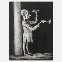 junger Mann, sich einen großen Nagel in den Kopf schlagend, Lithographie mit Tonplatte, 1955, unter der Darstellung rechts in Blei signiert "A. Paul Weber", links unten Stempel in Rot, im Stein links unten Monogramm "W", Papier leicht gebräunt und Fleck am Rand, in rahmenlosen Bilderträger gerahmt (hintere Scheibe defekt), Darstellungsmaße ca. 45,5 x 37 cm, Blattmaße ca. 70 x 60 cm. Künstlerinfo: Künstlername "A. Paul Weber", dt. Zeichner, Maler, Illustrator und Graphiker (1893 Arnstadt bis 1980 Schretstaken), studierte an der Kunstgewerbeschule Erfurt, ab 1916 als Zeichner und Karikaturist tätig, 1925 Gründung der “Clan-Presse”, 1928 Anschluss an den “Widerstandskreis” und Mitherausgabe der 1931–36 erscheinenden Zeitschrift “Widerstand”, deswegen 1937 Verhaftung und Arbeitsbeschränkung, nach 1945 wieder zeitkritische Graphiken, unter anderem für die “Griffelkunstvereinigung Hamburg”, 1959–80 Herausgeber des “Kritischen Kalender”, 1971 Ernennung zum Professor, tätig in Berlin und Schretstaken, Quelle: Thieme-Becker, Vollmer, Wikipedia und Internet.