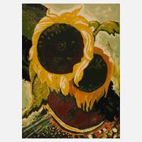 Blick auf zwei Sonnenblumenblüten in Vase, mit Fettkreiden überzeichneter Farbsiebdruck auf Velin, um 1960, rechts unten in Blei ligiertes Monogramm "W", rückseitig in Blei bezeichnet "H. Weidmann-Wilton", Papier leicht gebräunt, Druck durchschlagend, Darstellungsmaße ca. 28 x 20,5 cm, Blattmaße ca. 31,5 x 25 cm. Künstlerinfo: eigentlich Harry Weidmann, nannte sich später Harry Weidmann-Wilton, dt. Maler, Graphiker, Bühnenbildner, Schauspiel-Regisseur und Entwerfer (1900 Wiesbaden bis 1969 Albufeira/Algarve), Ehemann der Theater- und Filmschauspielerin Henny Schramm (1908–1999), zunächst Studium an der Kunstgewerbeschule Berlin-Charlottenburg, später Studium an der Staatlichen Lehranstalt des Berliner Kunstgewerbemuseums bei Emil Orlik, Willy Jäckel und Otto Ludwig Haas-Heye, unternahm Studienreisen nach Spanien, Portugal und Italien, 1923–33 tätig als Ausstattungs-Chef an den Vereinigten Theatern (Lobe Theater) in Breslau, wirkte darüber hinaus an Theatern in Berlin, Dresden, Paris und London, Mitglied des Kasseler Kunstvereins und des Bundes bildender Künstler, ab 1937 in Kassel ansässig, verstarb auf einer Urlaubsreise in Portugal, Quelle: Schmaling "Künstlerlexikon Hessen-Kassel 1777–2000", Infos aus dem Nachlass und Internet.