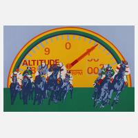 auf den Betrachter zureitende Jockeys vor einer überdimensionierten Anzeige, Farbsiebdruck, unter der Darstellung in Blei rechts betitelt, teils unleserlich signiert und datiert "Derby J. Bodo ... 1971" sowie links bezeichnet und gewidmet "Probedruck, in diesem Fall für Michael Dultz", leichte Altersspuren, unter Passepartout und hinter Glas gerahmt, Darstellungsmaße ca. 46 x 67,5 cm.