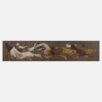 abstrahierende figürliche Komposition, Farblithographie auf leichtem Karton, unter der Darstellung in Blei rechts signiert "Jaques Villon" und links nummeriert "24/250", in der Darstellung nochmals signiert und datiert "Jaques Villon (19)50", gebräunt, leichte Knickspur, außerhalb der Darstellung wasserrandig, Darstellungsmaße ca. 38 x 55 cm, Blattmaße ca. 51,5 x 69 cm. Künstlerinfo: eigentlich Gaston Èmile Duchamp, franz. Maler und Graphiker (1875 Damville bis 1963 Puteaux bei Paris), Bruder der Künstler Raymond Duchamp-Villon, Suzanne Duchamp und Marcel Duchamp, Studium der Rechtswissenschaften und kurzzeitig als Notar tätig, ab 1894 Studium an der Ècole nationale supérieure des beaux-arts in Paris und 1894–1906 als Karikaturist für mehrere Pariser Zeitschriften tätig sowie Plakatentwerfer, 1899 bis 1909 druckte er bei Eugéne Delâtre ca. 60 Farbaquatintaradierungen, Umzug nach Puteaux, ab 1912 Mitglied der Künstlergruppe Section d' Or, 1913 Teilnahme an der Armory Show in New York, 1919 erste ungegenständliche Bilder, ab den 1940er Jahren Beschäftigung mit der Buchillustration, 1950 Verleihung des Carnegie-Preises in Pittsburgh, 1956 Großer Preis der Biennale in Venedig, Teilnahme an der documenta I und II sowie posthum an der documenta III, Quelle: Thieme-Becker, Vollmer, Bénécit und Wikipedia.